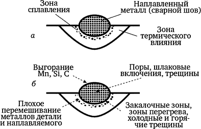 Рис. 3. Зоны сварного шва (а) и возможные дефекты в нем (б)