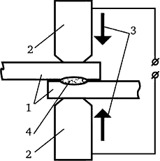 1 – свариваемые детали; 2 – электроды; 3 – усилие сжатия; 4 – сварочная ванна