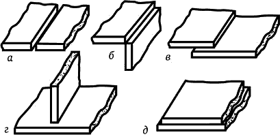 а – стыковое; б – угловое; в – нахлесточное; г – тавровое; д – торцовое