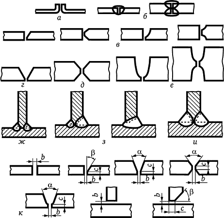 а – с отбортовкой кромок; б – без разделки кромок; в – с разделкой одной кромки: г – с односторонней разделкой двух кромок; д – с Х-образной разделкой двух кромок; е – с U-образной разделкой; ж – без разделки; з – с односторонней разделкой; и – с двусторонней разделкой; к – конструктивные элементы разделки