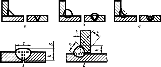 Сварные швы могут быть стыковыми и угловыми (рис. 6, а – г). Стыковой шов – сварной шов стыкового соединения. Угловой шов – сварной шов углового, таврового и нахлесточного соединений. Разновидностью этих типов являются швы пробочные и прорезные, выполняемые в нахлесточных соединениях.
