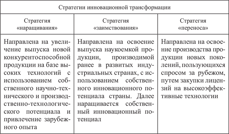 Таблица 1.5. Характеристика стратегий инновационной трансформации экономики развивающихся государств