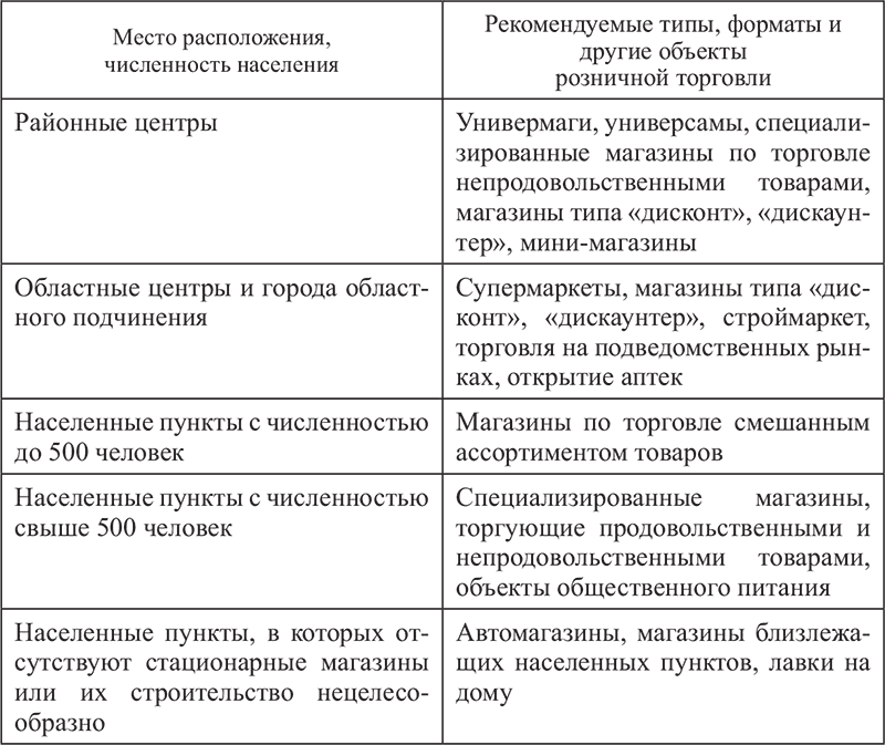 Таблица 1.7. Рекомендуемая дислокация объектов розничной торговли в соответствии с «Отраслевой программой развития потребительской кооперации на 2011–2015 гг.»