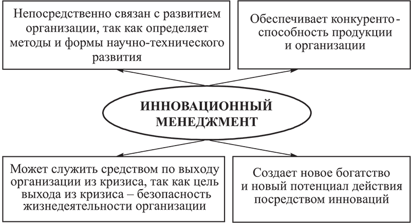 – инновационный менеджмент непосредственно связан с развитием организаций, так как он определяет методы и формы научно-технического развития;