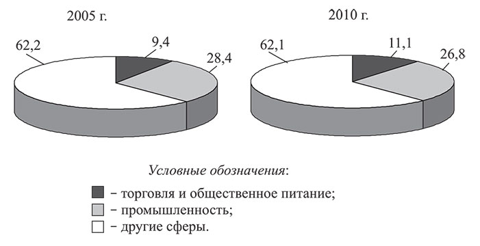 Рис. 3.2. Участие торговли и общественного питания в ВВП Беларуси в 2005 и 2010 гг.