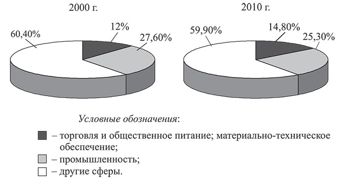 Рис. 3.3. Удельный вес торговли и других сфер коммерческой деятельности в общей численности занятого населения Беларуси в 2000 и 2010 гг.