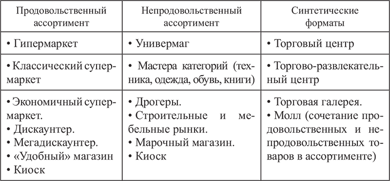 Таблица 3.5. Зарубежная классификация форматов торговли по принципу преобладания продовольственных или непродовольственных товаров в ассортименте