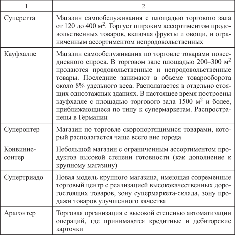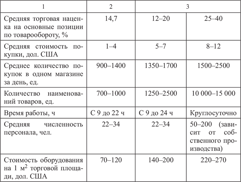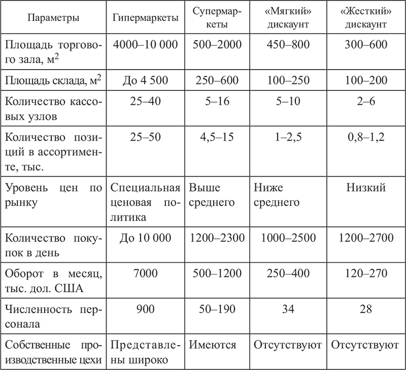 Таблица 3.9. Характеристики некоторых зарубежных форматов торговли