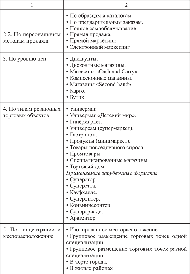 Пример зарубежной классификации форматов торговли приведен в табл. 3.5. Как видно из данной таблицы, розничная торговля подразделяется на торговлю продуктами питания и торговлю потребительскими товарами. Поэтому графы 1, 2 этой таблицы рассматривают торговлю в таком разрезе. Что касается графы 3, то в ней приводятся наиболее современные типы торговых форматов, возникшие в последнее время в мировой торговле.
