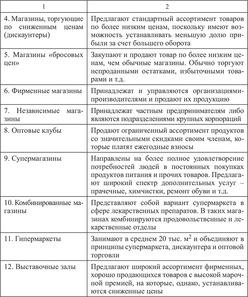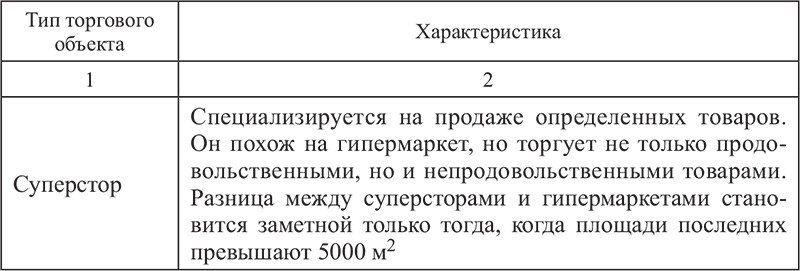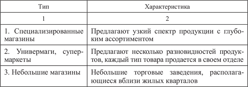 Таблица 3.8. Характеристика форматов розничной торговли по типам