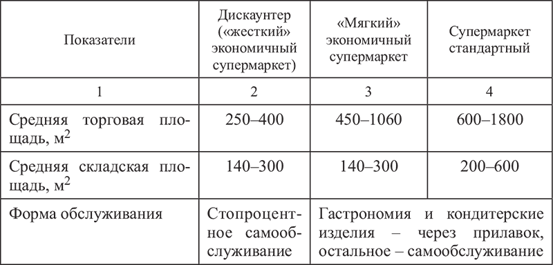Таблица 3.10. Характеристика зарубежных типов супермаркета
