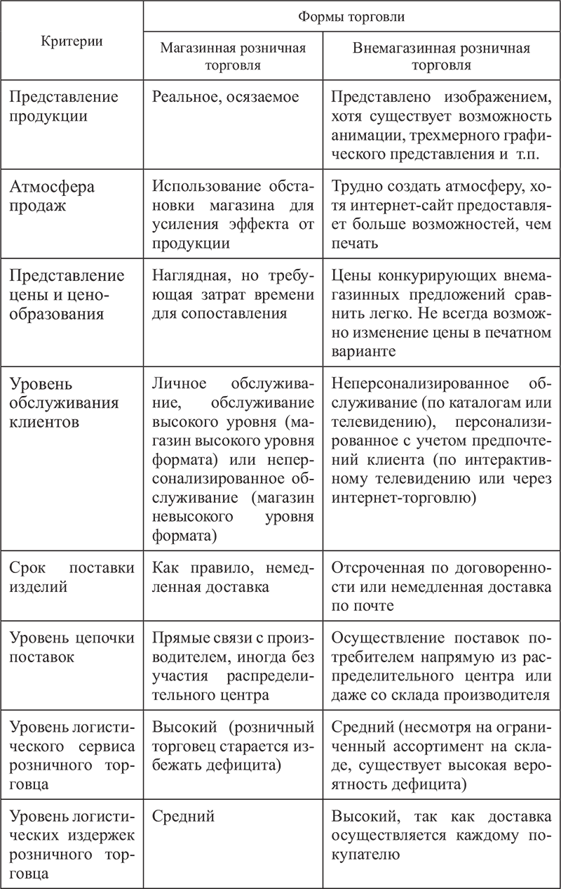 Таблица 3.12. Основные различия между магазинным и внемагазинным способами ведения розничной торговли