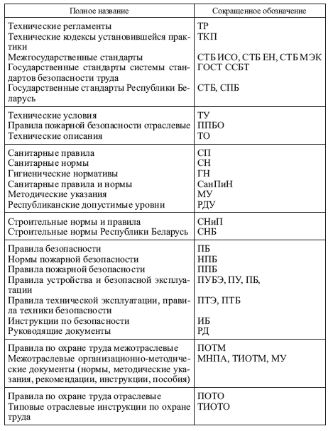 Как видно из рис. 1.1, нормативная правовая база по охране труда весьма обширна. В нее входят десятки ТР и ТКП, более 600 стандартов безопасности труда, сотни строительных норм и правил, санитарных правил и норм, гигиенических нормативов, норм и правил пожарной безопасности, правил безопасности эксплуатации конкретного оборудования, которые кроме полного названия имеют общепринятые сокращенные обозначения (табл. 1.1).