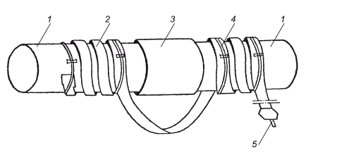 Рис. 3.7. Горячее отверждение клеевого соединения труб бандажного типа с помощью гибкого ленточного нагревателя типа ЭНГЛ-180:1 – концы труб; 2 – гибкий ленточный нагреватель; 3 – клеевое соединение; 4 – стеклолента для фиксации витков нагревателя на поверхности трубы; 5 – выводы электронагревателя