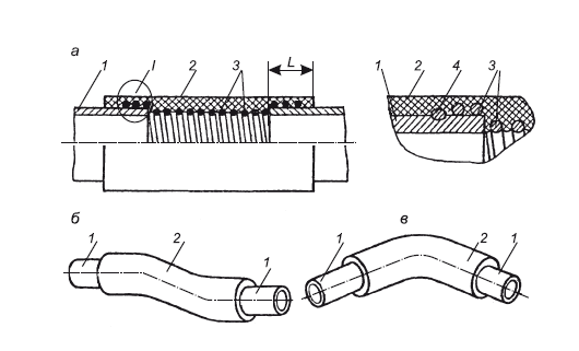 Рис. 3.8. Клеевые соединения труб бандажного типа с навивным каркасом: а – в виде линейной вставки; б – при параллельном смещении осей соединяемых труб; в – в виде отвода; 1 – концы склеиваемых труб; 2 – бандаж; 3 – навивной каркас; 4 – зачеканка витка навивного каркаса в трубу