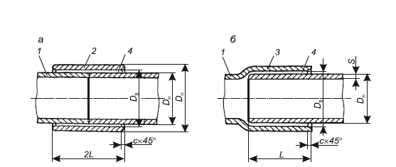 Раструбные (муфтовые) и клеемеханические соединения. Конструктивно-технологические параметры раструбных (муфтовых) клеевых соединений труб приведены на рис. 3.9. Детали соединений изготовляют из труб по ГОСТ 8732-78 и ГОСТ 8734-75. Раструбы получают с помощью станков «ПГ-100», «Восток Д45-325» или другого специализированного оборудования.