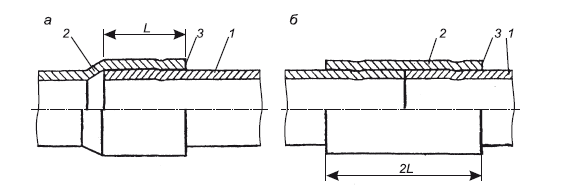 Рис. 3.10. Клеемеханическое соединение труб: а – раструбное; б – муфтовое; 1 – концы склеиваемых труб; 2 – раструб (муфта); 3 – клей