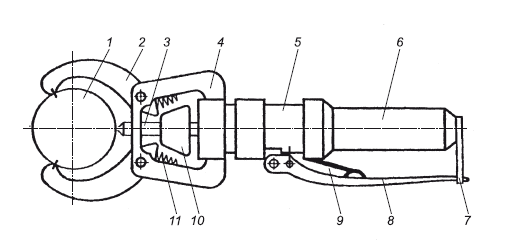 Рис. 3.11. Устройство для точечного обжима клеемеханических соединений труб: 1 – труба; 2 – рычаг; 3 – пуансон; 4 – кронштейн; 5 – насос; 6 – масляный бак;7 – петля; 8 – рукоятка; 9, 11 – пружина; 10- поршень