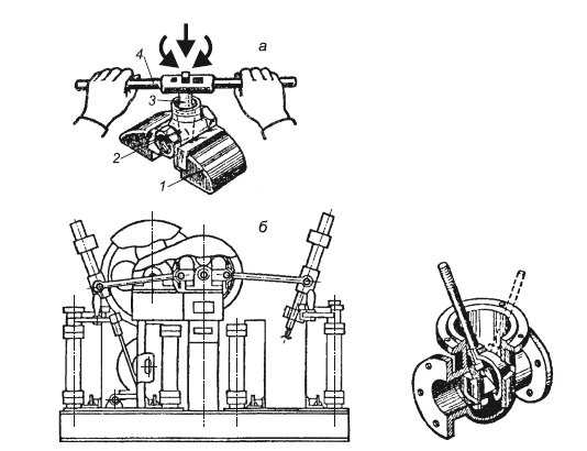 Притирку вручную (рис. 4.6, а) выполняют следующим образом. Очищают притираемые поверхности от пыли, грязи и насухо вытирают. Затем корпус крана зажимают в тисках отверстием вверх. На пробку или конический притир наносят ровным слоем абразивную пасту, после чего вводят в притираемое отверстие. На хвостовик пробки или притира надевают вороток и вращают, делая неполные обороты то в одну, то в другую сторону, после чего совершают полный оборот. После 15–20 оборотов притир вынимают, насухо протирают тряпкой, наносят на него абразивную пасту и снова продолжают совместную притирку пробки с краном до тех пор, пока притираемые поверхности не станут матовыми.