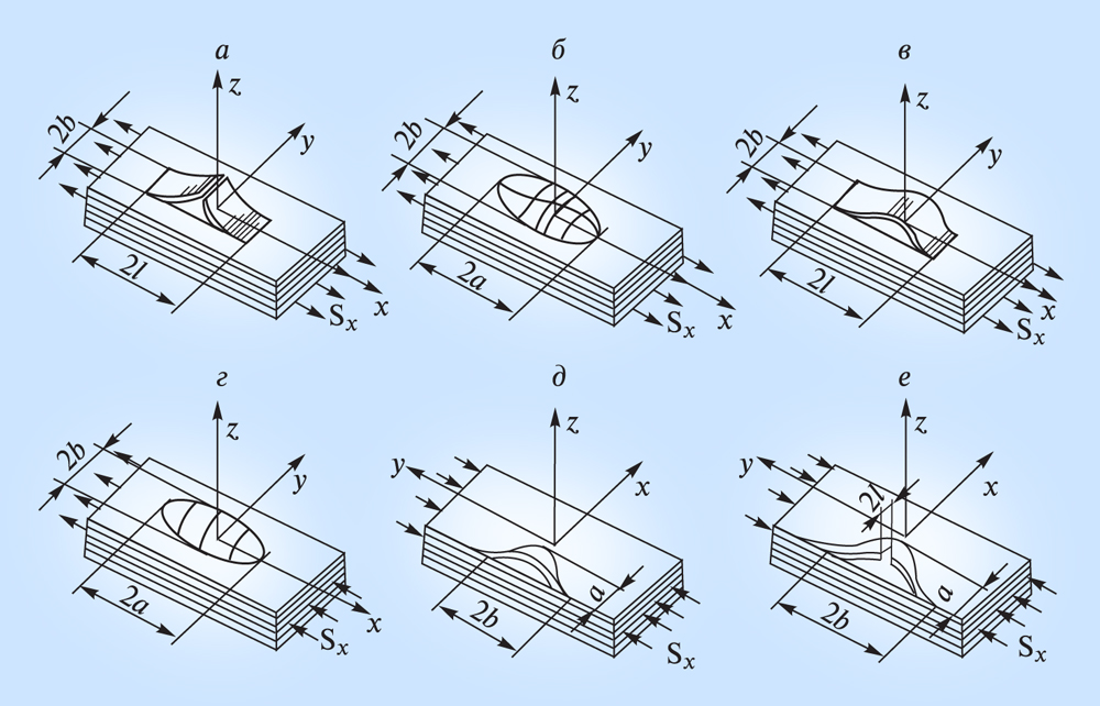 а – открытое отслоение при растяжении, б – эллипсоидальное при растяжении, в – сжатое в условиях цилиндрического изгиба, г – эллипсоидальное при сжатии, д – кромочное, е – кромочное с вторичной трещиной