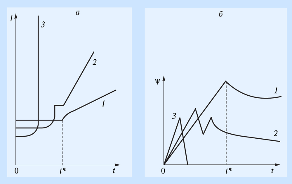 Для расчета роста отслоений в сжатых элементах нужно учитывать энергию изгиба, высвобождающуюся при росте выпученного отслоения. Некоторые качественные особенности роста отслоения, изображенного на рисунке 2.2, в, приведены на рисунке 2.3. Кривые 1–3 соответствуют начальным состояниям. Кривая 1 относится к случаю, когда начальный размер отслоения достаточно велик, но начальное состояние субравновесно. После окончания инкубационной стадии продолжительностью t* размер l начинает расти. Картина роста отслоения качественно сходна с той, которая наблюдается в случае растяжения.