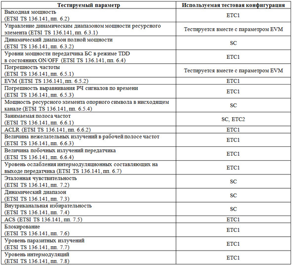 Перед проведением тестирования любого параметра требуется задать режим работы базовой станции с одной несущей (SC, Single Carrier) или несколькими (MC, Multi – Carrier). Режим работы с несколькими несущими делится на режимы с использованием функции объединения несущих (особенности нумерации рабочих полос частот при объединении несущих приведены в пп. 5.5 спецификации ETSI TS 136.141) и без такового. Режим работы с несколькими несущими предусматривает необходимость выбора соответствующей тестовой конфигурации (ETC, E-UTRA Test Configuration). Выбор тестовой конфигурации должен производиться, исходя из определения в соответствии с пп. 4.6.8 спецификации ETSI TS 136.141 поддерживаемых радиочастотных конфигураций. В пп. 4.10 указанной спецификации определено 5 тестовых конфигураций для режимов работы с несколькими несущими и/или с использованием функции объединения несущих. ETC1 применяется при работе со смежными участками спектра частот при проведении тестирования всех параметров радиооборудования базовых станций без использования функции объединения несущих. При тестировании параметров приемников с использованием ETC1, необходимо для каждой поддерживаемой рабочей полосы частот обеспечить генерацию тестовым оборудованием двух крайних несущих в рабочем спектре частот. ETC2 применяется при работе со смежными участками спектра частот при проведении тестирования с использованием функции объединения несущих. ETC3 применяется при работе с несмежными участками спектра частот при проведении тестирования всех параметров радиооборудования базовых станций без использования функции объединения несущих. При тестировании параметров приемников с использованием ETC3, необходимо для каждого поддерживаемого частотного подблока обеспечить генерацию тестовым оборудованием двух крайних несущих в рабочем спектре частот. ETC4 применяется при работе с несколькими полосами частот для проверки аспектов эксплуатации, связанных с использованием максимального поддерживаемого числа несущих. ETC5 применяется при работе с несколькими полосами частот для проверки аспектов эксплуатации, связанных с использованием сокращенного числа несущих при высокой спектральной плотности мощности на несущую (PSD, Power Spectral Density). Методика сборки и рекомендации по настройке каждой тестовой конфигурации соответственно приведены в пп. 4.10 спецификации ETSI TS 136.141. Применимость тестовых конфигураций для тестирования параметров радиооборудования базовых станций описана в таблицах 2.1, 2.2 и 2.3.