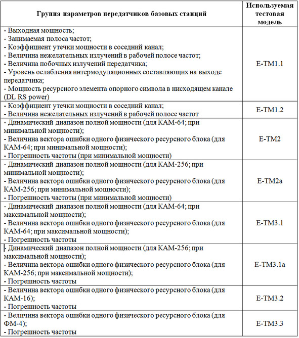 В пп. 6.1 спецификации ETSI TS 136.141 определены численные значения параметров физических каналов базовых станций (работающих как в режиме FDD, так и в режиме TDD соответственно), которые должны быть заданы перед началом тестирования при любой тестовой конфигурации. Данные параметры описываются тестовыми моделями (E-TM, E-UTRA Test Models). Каждая тестовая модель предназначена для тестирования определенной группы параметров передатчиков базовых станций. Установка мощности физических каналов относительно уровня мощности опорного символа должна производиться при максимальной погрешности +/– 0.5 дБ. В таблице 2.4 представлено соответствие групп параметров базовых станций тестовым моделям. Все E-TM должны соответствовать следующим обязательным условиям: тестовая модель определена для одного антенного порта, 1 кодового слова, 1 уровня, не предусматривает использование прекодирования, если не определено иное; кадр состоит из 10 подкадров (10 мс); используется нормальный циклический префикс; виртуальные ресурсные блоки локализованного типа, для канала PDSCH нет скачков в пределах подкадра; специальные опорные сигналы для абонентских станций не используются.