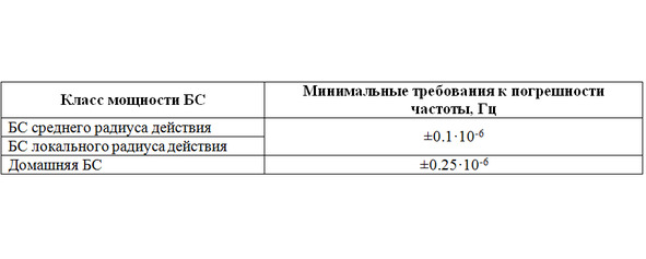 Таблица 2.7. Допустимые значения погрешности частоты для базовых станций различных классов мощности
