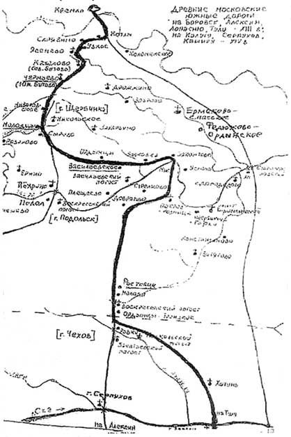 В южном направлении от Москвы были проложены дороги на стоящие по Оке города Коломну, Каширу, Лопасню, Серпухов, Алексин и Калугу. Особо важное государственное значение среди них приобрела Большая Ордынская дорога. Она шла из Москвы через Любасню на Тулу, куда берегами Дона приводила на Великий Переволок Волго-Донского междуречья и в столицу Золотой Орды город Сарай на реке Ахтубе (см. рис. 14).