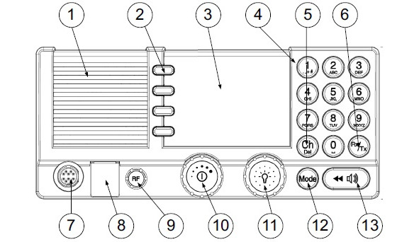 12. Кнопка выбора режима работы: SSB, AM Broadcast, DSC, Telex.