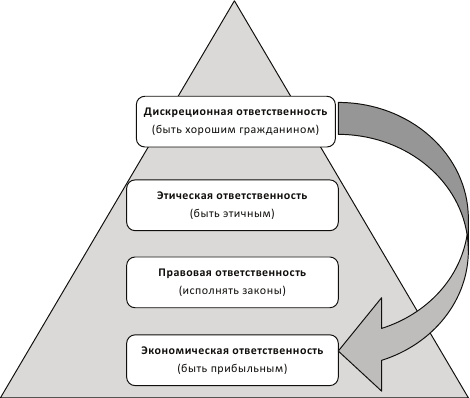 В-третьих, само участие в смягчении или решении социальных проблем относится к корпоративной социальной ответственности (КСО), присущей бизнесу как таковому. Согласно определению, представленному в пункте 2.18 «ГОСТ Р ИСО 26000-2012. Национальный стандарт Российской Федерации. Руководство по социальной ответственности», под социальной ответственностью подразумевается «ответственность организации за воздействие ее решений и деятельности на общество и окружающую среду через прозрачное и этичное поведение, которое содействует устойчивому развитию, включая здоровье и благосостояние общества; учитывает ожидания заинтересованных сторон; соответствует применяемому законодательству и согласуется с международными нормами поведения; интегрировано в деятельность всей организации и применяется в ее взаимоотношениях». Иными словами, «социальное воздействие» суть атрибут КСО. При этом для бизнеса в целом не столь важно непосредственно участвовать в смягчении или решении социальных проблем – «быть хорошим гражданином». Согласно классической модели А. Керолла [Carroll, 1991, p. 42], это относительно малозначимый, дискреционный уровень КСО, к которому традиционно относят благотворительные программы, не связанные с основным видом деятельности субъектов бизнеса (рис. 1.1).