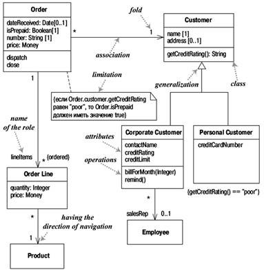 When building a class diagram most of the time spent on representation of various constraints. Figure 6 shows that the Order (Order) can only be made by a single Customer (Customer). Of this class diagram also shows that each LіneІtem (order) is considered separately. Next chart argues that corporate clients have loans, and individual customers – no.