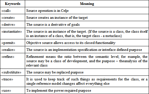 UML includes many kinds of dependency, each with particular semantics and keywords. Basic relationship, sketched here, the most useful and commonly used without keywords. To make it more detailed, you can add the appropriate keyword (Table 2).