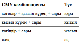 Мысалы, кейбір CMY (а?ылш. С – Cyan, к?гілдір, M – Magenta, ?ызыл к?ре?, Y – Yellow, сары) комбинацияларын 2.3-кестеде келтірейік.