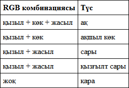 RGB (а?ылш. Red, Green, Blue – ?ызыл, жасыл ж?не к?к) комбинациялары