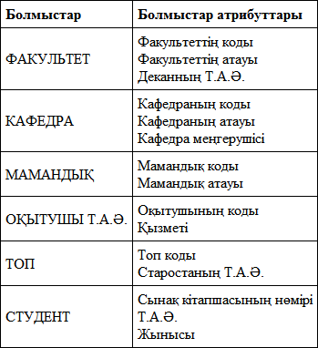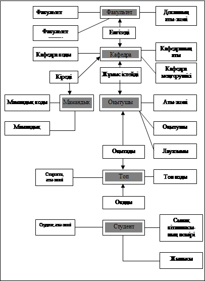 Бес байланыс н?с?ар ар?ылы белгіленіп, ба?ыттал?ан м?ндерді байланыстырады: ?ОСЫЛУ ара?атынасы бір факультетте бірнеше кафедра бар болуын к?рсетеді; КІРУ ара?атынасы бір кафедрада студенттерді бірнеше маманды? бойынша бітіре алатынын к?рсетеді; Ж?МЫС ІСТЕЙДІ ара?атынасы бір кафедрада бірнеше о?ытушылар бар екендігін к?рсетеді; екі?шты н?с?ары бар ?ЙРЕТЕДІ ара?атынасы бір о?ытушы бірнеше топ?а саба? бере алатынын, ал бір топ бірнеше о?ытушыда о?и алатынын к?рсетеді; ?ЙРЕНУ ара?атынасы бір топ бірнеше студенттерден т?ратынын к?рсетеді.