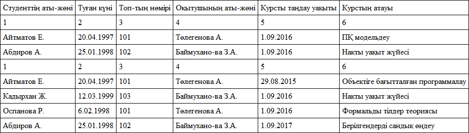 Студенттерді? та?да?ан курстары мен о?ытушылары туралы деректен т?ратын Д?-ны ??ру керек. Алдымен студентті? аты-ж?ні, оны? ту?ан к?ні, студент жататын топты? н?мірі, о?ытушыны? аты-ж?ні, курсты та?дау уа?ытынан т?ратын кесте (5.1-кесте).