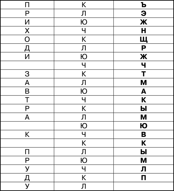 Можно заметить, что чаще всего здесь встречается буква «А». Итак, первая буква ключа найдена. Я рекомендую тебе тщательно подсчитать в каждом столбце количество букв и определить наиболее часто встречающуюся, после чего понять ключ.
