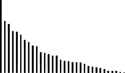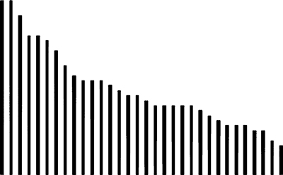 Ты можешь представить себе, что эти графики – набор вертикальных штырьков, на которые нанизаны блины, как в детской пирамидке или головоломке «ханойская башня». Количество блинов на штырьке соответствует количеству целых процентов, а последний блин по толщине соответствует долям процента. Если расположить эти башни по убыванию количества блинов, то как раз получатся такие гистограммы. По горизонтали отложены буквы по убыванию частот их в языке, а по вертикали – относительные частоты в процентах.