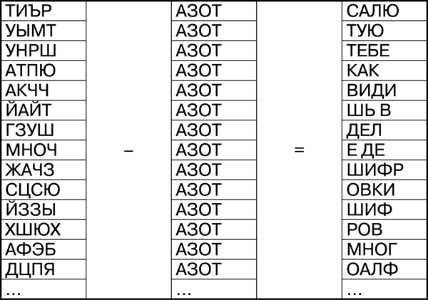 Если у тебя все получилось, то нашелся ключ – «АЗОТ» (это газ). И теперь можно легко расшифровать секретное послание. Как я уже писал, надо из шифрограммы вычесть ключ по модулю 32. Вот так: