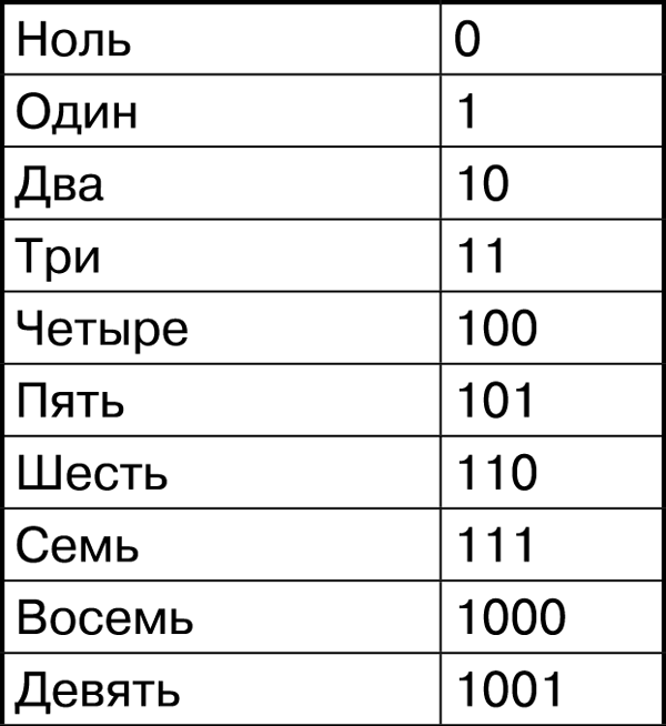 Есть и ещё одна шутка: в мире существует 10 типов людей – те, кто знает двоичную систему, и те, кто не знает её. Надеюсь, что теперь ты можешь посмеяться над ней вместе со мной, поскольку и ты теперь знаешь двоичную систему.