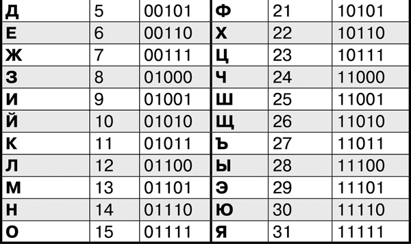 Таким образом можно закодировать все символы нашего алфавита от пробела до буквы «Я». Все они получают номер от 0 до 31 в десятичной системе счисления и код от 00000 до 11111 в двоичной. Вот интересная таблица, которую я рекомендую тебе выучить наизусть: