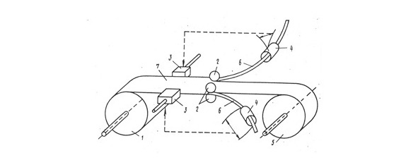 При обрезке кромок стальной полосы на агрегате продольной резки, необходимо центрировать полосу (7), чтобы обрезать дисковыми ножами (2) достаточно широкие кромки, удаляя все трещины. Но полоса постоянно движется в сторону, поэтому специальный рабочий постоянно регулирует ее положение на агрегате резки рулонов. Чтобы автоматизировать работу агрегата, предложено пропускать обрезаемую кромку (6) через кольцо двух электрических контуров (4). Через один пропускается переменный ток, который наводит ток во второй обмотке. При этом, чем больше ширина обрезаемой кромки, тем больше сигнал. Сигналы, получаемые с двух сторон полосы, сравниваются, и их разность направляется в управляющее устройство (3), которое эффективно заменяет рабочего.