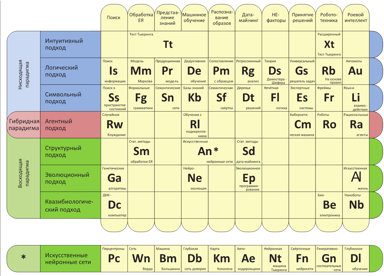 Что интересно, если попытаться расположить в матрице подходы и парадигмы в строках, а решаемые задачи в столбцах, то получится своеобразная «периодическая система технологий искусственного интеллекта», в ячейках которой будут перечислены различные методы конкретного подхода для решения конкретной задачи. Вот так может выглядеть такая матрица.