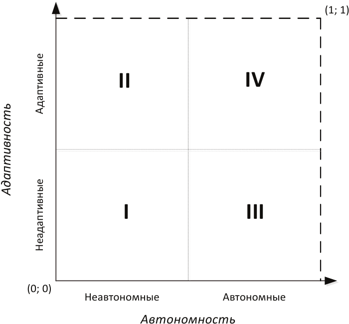 Если рассмотреть относительные шкалы для описания и классификации технических систем по степеням их адаптивности и автономности, то можно представить непрерывное двумерное пространство, в котором каждая точка может соответствовать определённой технической системе с заданными степенями адаптивности и автономности от точки (0, 0) – полностью неадаптивная и неавтономная система – до точки (1, 1) – совершенно адаптивная и автономная система. Эта мысль проиллюстрирована следующей схемой.