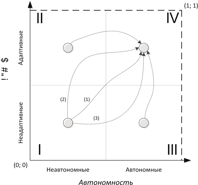 Таким образом, интеллектуализация представляет собой процесс перевода (эволюции) технической системы из её текущего положения в пространстве «Адаптивность – Автономность» в четвёртый квадрант как можно ближе к точке (1; 1). Из квадрантов II и III такой переход может быть осуществлён непосредственно, в то время как в квадранте I может существовать три возможные траектории интеллектуализации системы, что показано на следующей схеме.