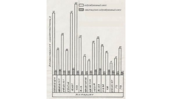 Рис. 1.16. Относительная износостойкость наплавок при гидроабразивном и совместным кавитационно-гидроабразивном износах