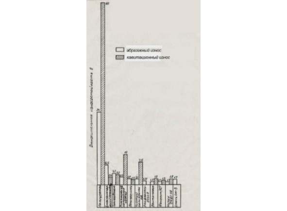 На рис. 1.16 представлена диаграмма относительной износостойкости тех же наплавок при гидроабразивном и при совместном кавитационно-гидроабразивном износах. Испытания проводились на той же струеударной установке. При испытаниях на гидроабразивный износ струя воды содержала 7?8% чистого кварцевого песка с диаметром песчинок около 0,2 мм.