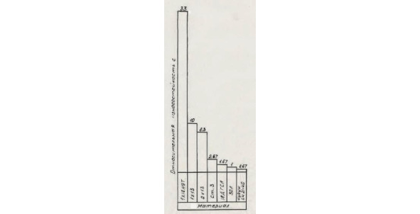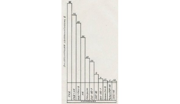 На рис. 1.18 приведена диаграмма относительной износостойкости резин. Испытания на гидроабразивный износ проводились на струеударной установке в струе воды содержащей 20% абразива, состоящего из речного песка крупностью 0,5?2 мм (78%) и 2?7 мм (22%).