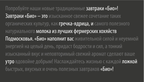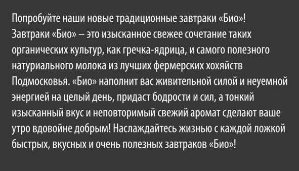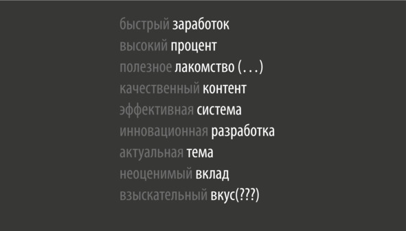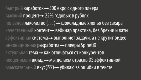Всякие подводки, оценочные слова и прочий Bullshit он пропускает, либо читает и не запоминает, и, самое важное, не анализирует. Текст даже не входит к человеку в голову в виде 25-го кадра потому, что у него в голове все уже занято аналогичной рекламой из телевизора, радио и прочих источников. Естественно, эту белиберду читать никто не будет.